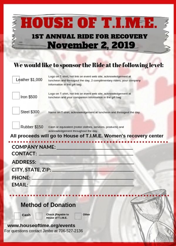 Be part of the movement - Sponsor our 1st Annual Ride for Recovery. Please donate above, print receipt and attach to your sponsorship form. Contact Jimbo at 706-527-2136 for more details.